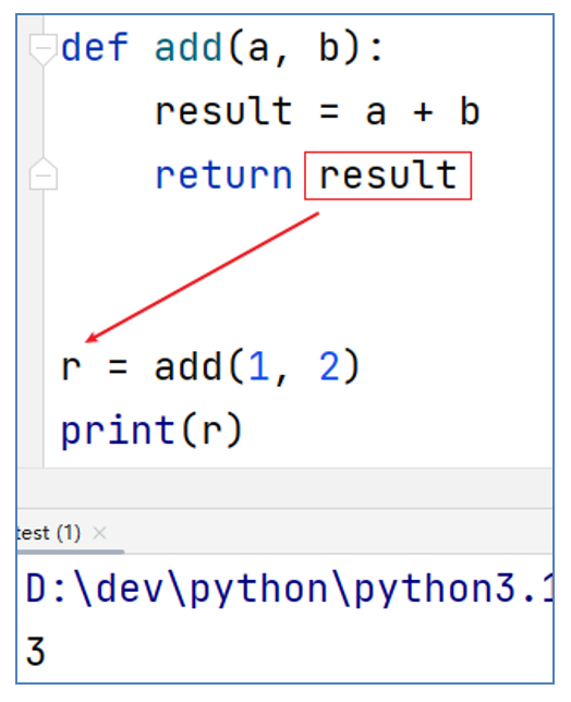 如上述代码定义两数相加的函数功能。完成功能后,会将相加的结果返回给函数调用者;所以,变量 r 接收到了函数的执行结果。