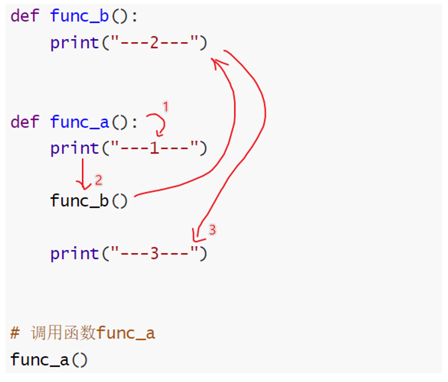 如果函数 A 中,调用了另外一个函数 B,那么先把函数 B 中的任务都执行完毕之后才会回到上次函数 A 执行的位置,继续执行函数 A 的剩余内容。
